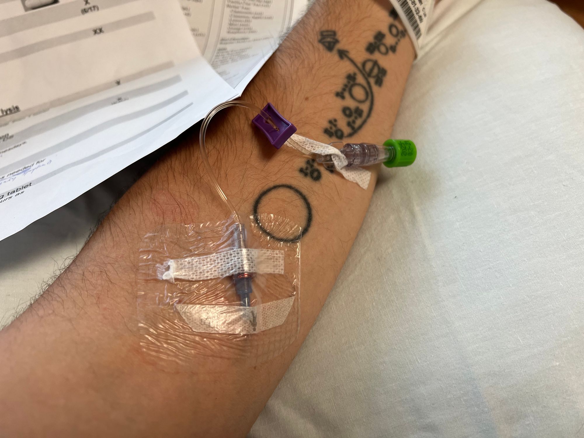 During my inpatient stay, I’ll get a PICC Line installed so they don’t have to keep needle-jabbing me. Thankfully I’m a pretty, uh, “veinous” guy but it’s obviously not comfortable. A couple of people have asked if I’ll get a port installed; the answer is no — that was on the table for my other chemo-focused treatments, but not for this one.